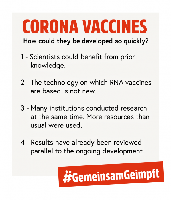 Safety, quality and efficacy - these criteria apply to the development and approval of all vaccines, regardless of whether the process is time-shortened or not. Covid-19 vaccines also underwent the same development steps as usual. The approved Corona vaccines, of course, went through a rigorous review process to receive approval. Even after their approval, the vaccines are regularly inspected and monitored.