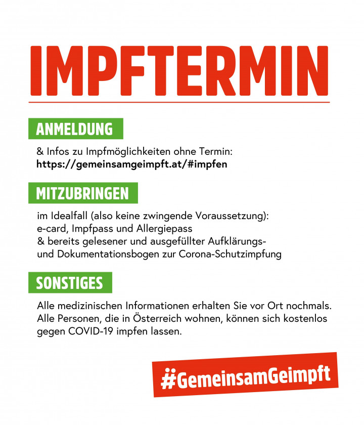Österreichweit können sich alle Bürgerinnen und Bürger schnell, unkompliziert und kostenlos gegen COVID-19 impfen lassen. Wo Sie die Corona-Schutzimpfung erhalten, wie die Impfung abläuft und was Sie zum Impftermin mitbringen müssen, erfahren Sie hier.