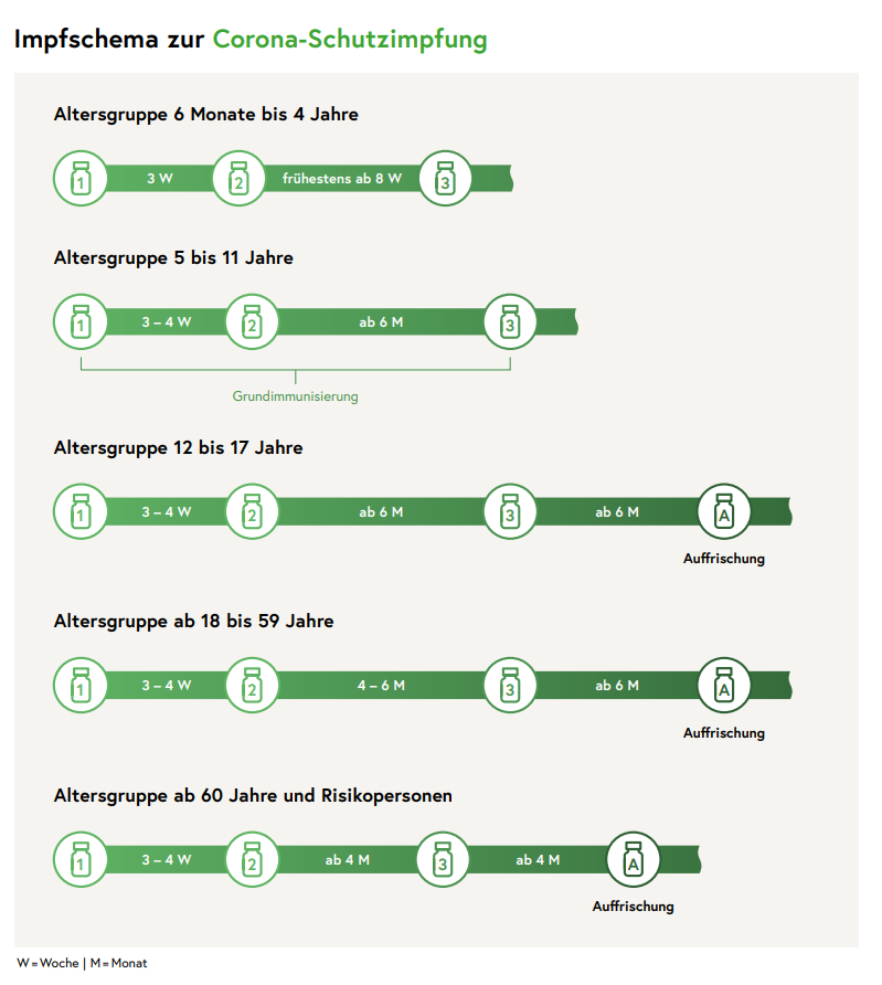 Die Corona-Schutzimpfung zählt zu den im Impfplan Österreich 2023 allgemein empfohlenen Impfungen. Sie wird in Österreich deswegen bis auf weiteres kostenfrei angeboten und ist für Kinder ab dem vollendeten 6. Lebensmonat möglich.